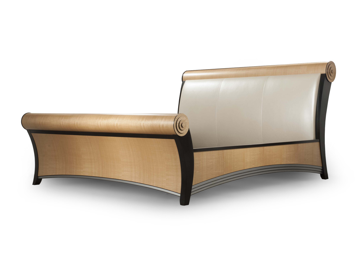 Ribbon sapeli top tubes and side rails with satin black headboard and footboard. Upholstered headboard inset (COM/COL). Open grain finish on all wood surfaces.