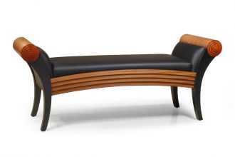 Bench: Ribbon sapeli arms and rails with black line detailing. Mahogany stepped endcaps with jet black legs. Upholstered seat (COM). Open grain finish on all wood surfaces.