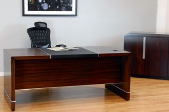 This beautiful desk features a leather top, Brushed satin aluminum detail, and a ribbon sapeli finish. All our work is made on a custom order basis to fit your specific needs.