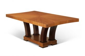 Natural starburst pattern Ribbon Sapeli top and bottom base. Legs are espresso maple with black bottom details. Comes with two, 18", self storing leaves.