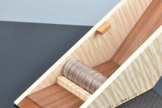 When the lid is removed, it reveals Kenedy half dollors coins inside, which create the balance that makes it stand upright. If you remove too many coins, the vessel will tip...