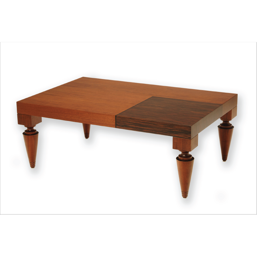 Mahogany Zoom Cocktail Table- With intricate turning, zebra wood accent with mahogany veneer.
