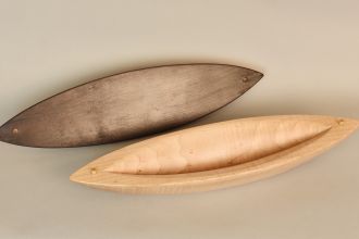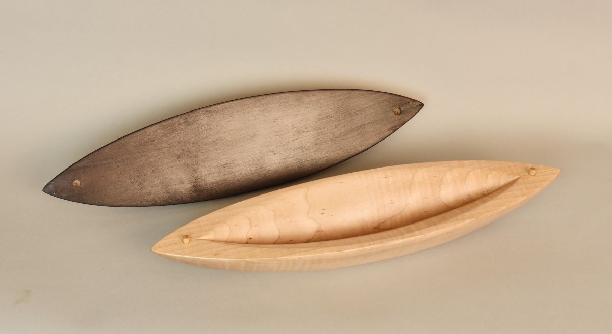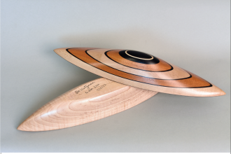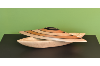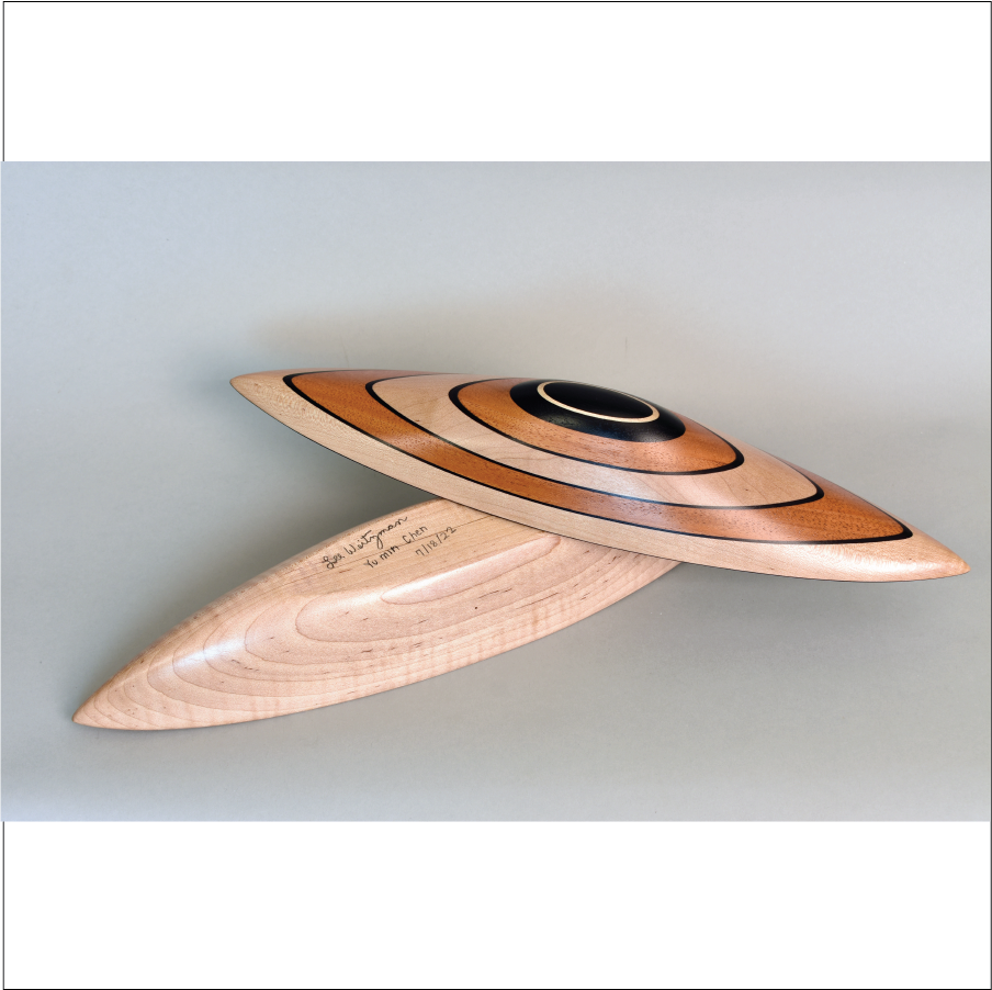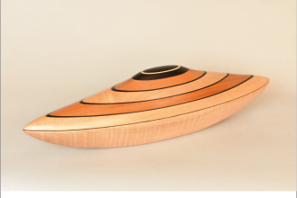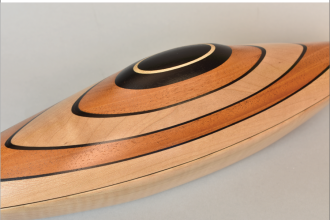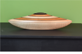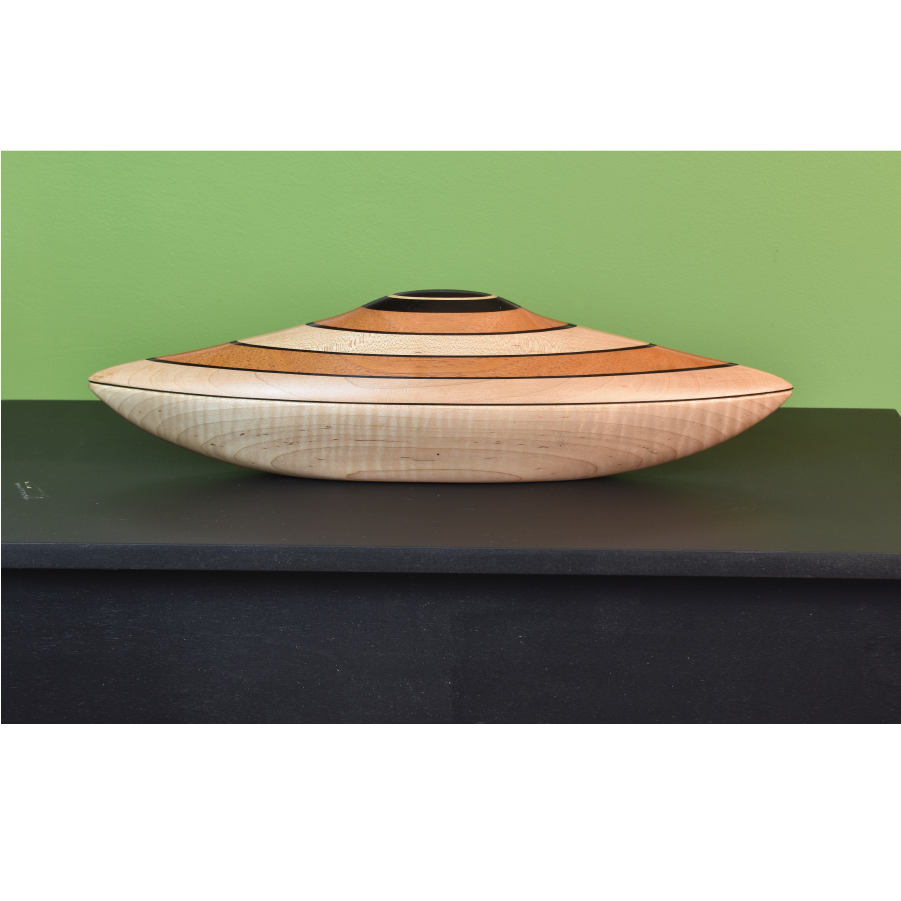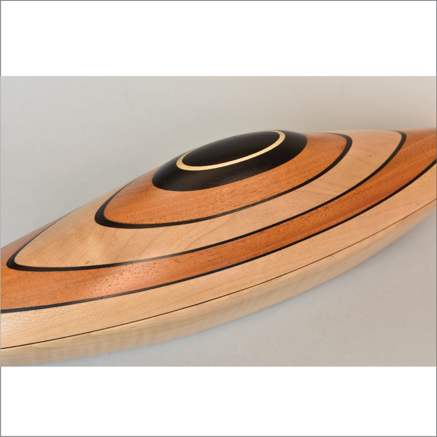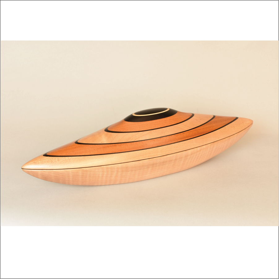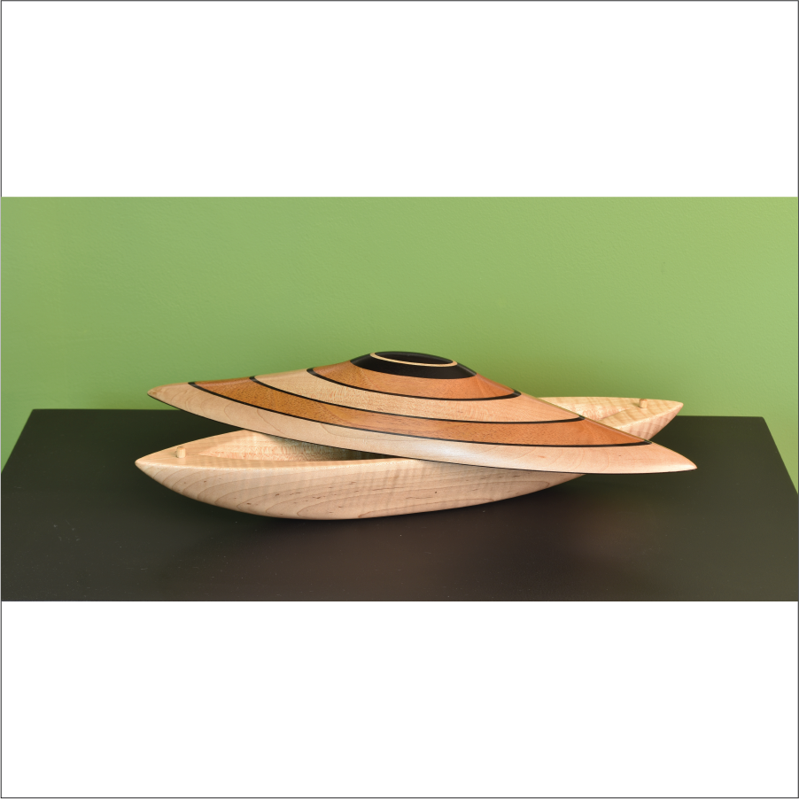 Exquisitely Sculpted wood Vessel with removable lid and interior storage opening. Curly Maple, Ebony, and Mahogany. Created in Collaboration with YU-Min Chen