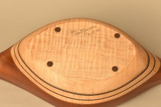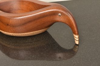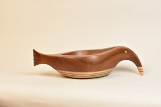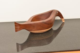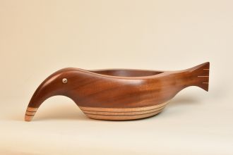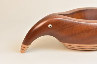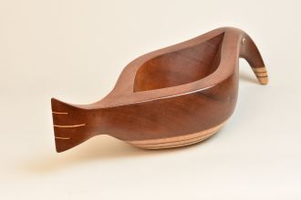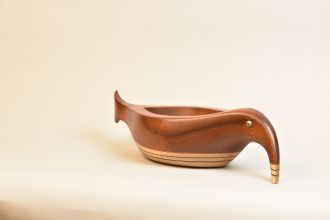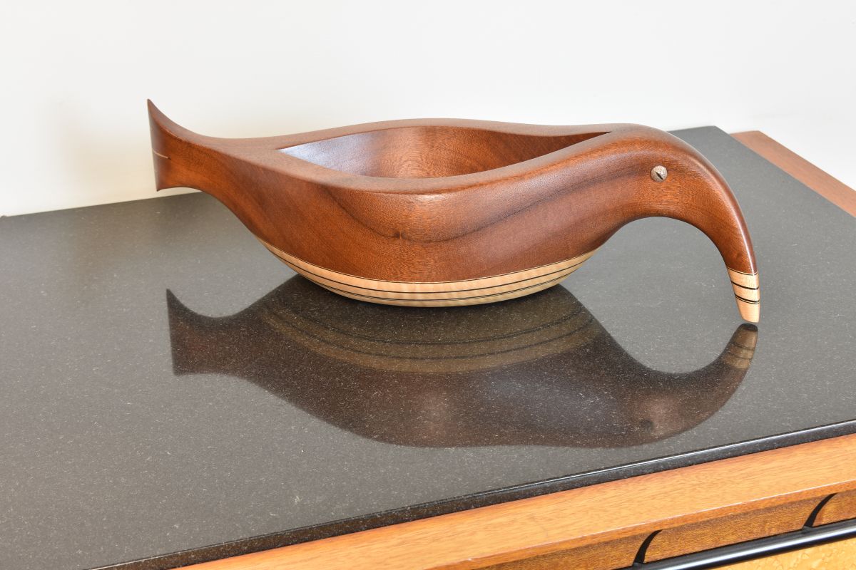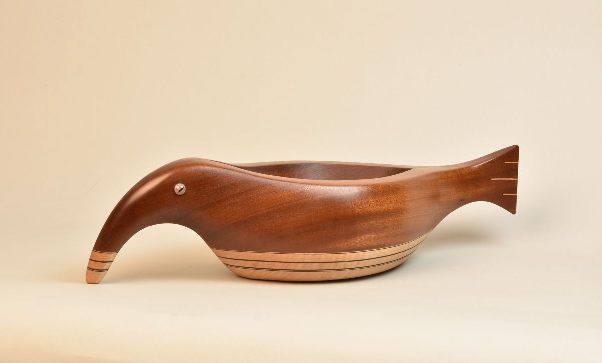 Sculpted Wood vessel that suggests an abstract combination of a bird and fish. Unique beautiful sculptural Vessel made of Mahogany, Curly Maple, and ebony. Features glass reptile eye detail. One of a kind, signed and dated.