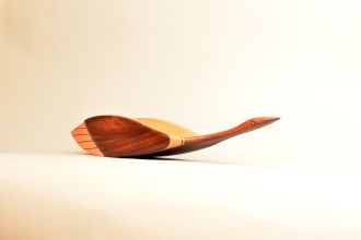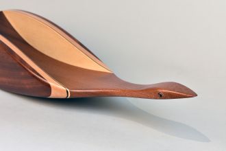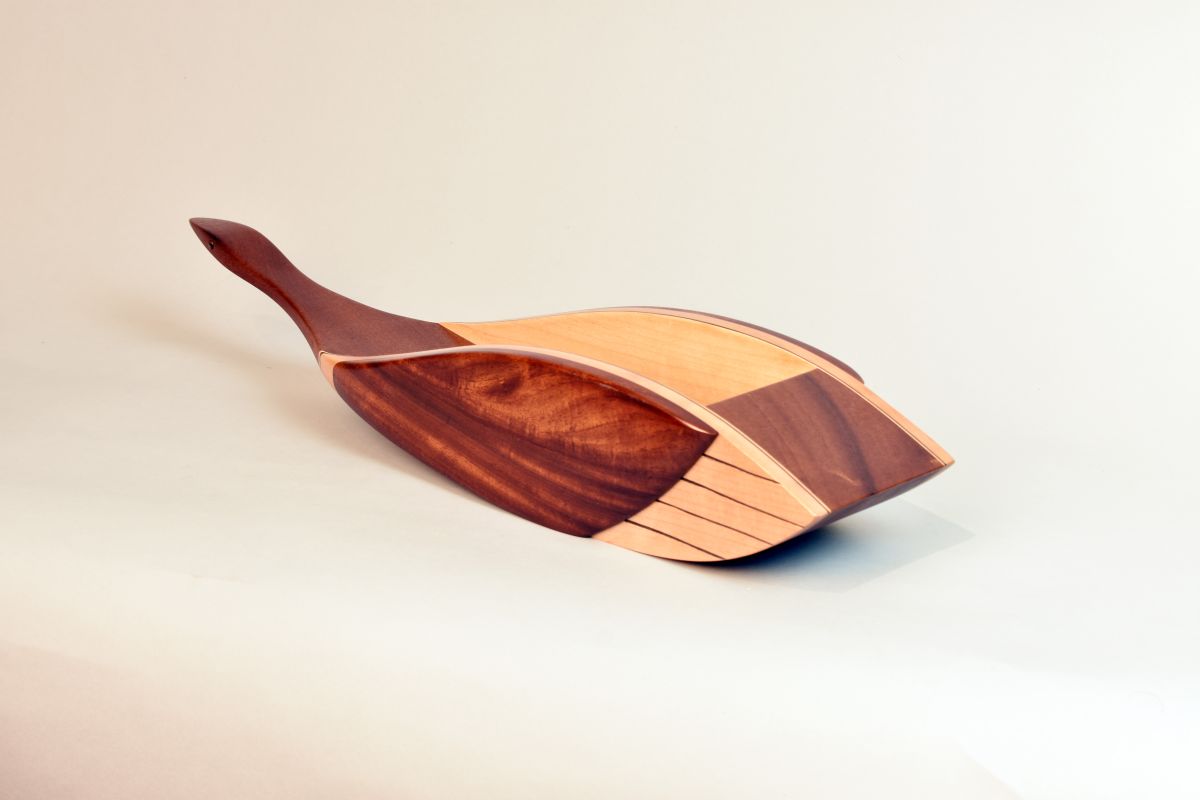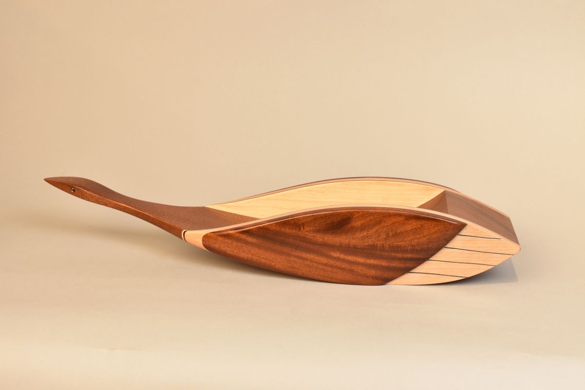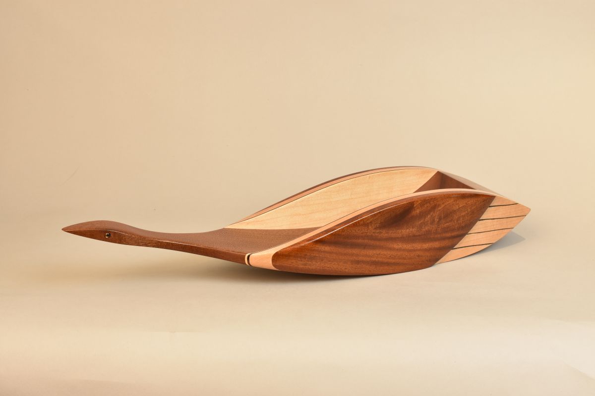 Figured Magoany with ebony and an curly maple and glass fish eyes. Carved black lines on tail. Beautifully carved and sculpted wood vessel that rocks back and forth as you push down on the head.
